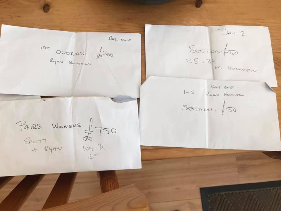 Unfortunately I was up all night being sick so I couldn’t fish today which I was gutted about. So my dad filled in for me, and he’s done an amazing job, winning his section today and adding 20lb to the weight, with Scott adding 10lb. This meant we ended up with 104lb overall which was enough to win the pairs 😊👍🍾🍾